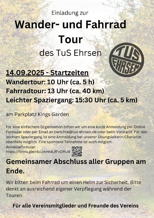 Wir laden herzlich ein zur diesjährigen Wander- und Fahrradtour im TuS. Meldet euch gerne an für die bessere Planung oder seid spontan dabei. Zusätzlich zu den beiden etwas anspruchsvolleren Touren wird es in diesem Jahr auch das erste Mal einen kleinen Spaziergang zusätzlich geben. Wir freuen uns auf euch! Den Link zur Anmeldung findet ihr über dem Bild.