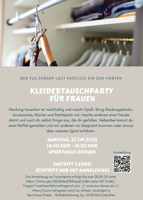 Der TuS Ehrsen lädt zur ersten Kleidertauschparty ein - bring Kleidung, Accessoires und Bücher die du nicht mehr trägst/benutzt mit und suche dir etwas Neues dafür aus. Wir freuen uns auf einen schönen Nachmittag. Weitere Infos in der Anmeldung.